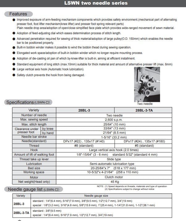 Seiko LSWN-28BL-3 إبرة مزدوجة عالية السرعة، خطاف محور عمودي كبير، غرزة عكسية، تغذية مركبة وقدم المشي، آلة الغرز المتشابكة (مجموعة كاملة)